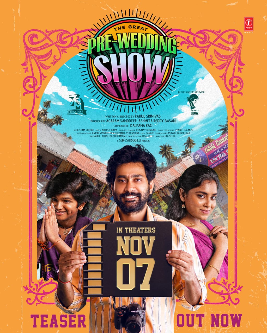 వెర్సటైల్ యాక్టర్ తిరువీర్, టీనా శ్రావ్య హీరో హీరోయిన్లుగా నటిస్తోన్న చిత్రం ‘ది గ్రేట్ ప్రీ వెడ్డింగ్ షో’. 7 పి.ఎం.ప్రొడక్ష్సన్స్, పప్పెట్ షో ప్రొడక్షన్స్ బ్యానర్స్పై సందీప్ అగరం, అస్మితా రెడ్డి బాసిని ఈ సినిమాను నిర్మిస్తున్నారు. రాహుల్ శ్రీనివాస్ దర్శకత్వం వహిస్తున్నారు. నవంబర్ 7న సినిమా రిలీజ్ కానుంది. ఈ నేపథ్యంలో చిత్ర యూనిట్ మంగళవారం టీజర్ను రౌడీ స్టార్ విజయ్ దేవరకొండ, సెన్సిబుల్ డైరెక్టర్ శేఖర్ కమ్ముల రిలీజ్ చేశారు. ‘ప్రపంచానికి తెలియటం కంటే ముందే తిరువీర్ గురించి నాకు తెలుసు. తను కలల ప్రపంచంలో జీవించటాన్ని చూసి నేను సంతోషపడుతుంటాను. ‘ది గ్రేట్ ప్రీ వెడ్డింగ్ షో’ టీజర్ చాలా ఆసక్తికరంగా చల్లటి గాలి మనసుని హత్తుకున్నట్లు ఉంది’ అని విజయ్ దేవరకొండ సోషల్ మీడియాలో చిత్ర యూనిట్ని అభినందించారు. టీజర్ను గమనిస్తే..