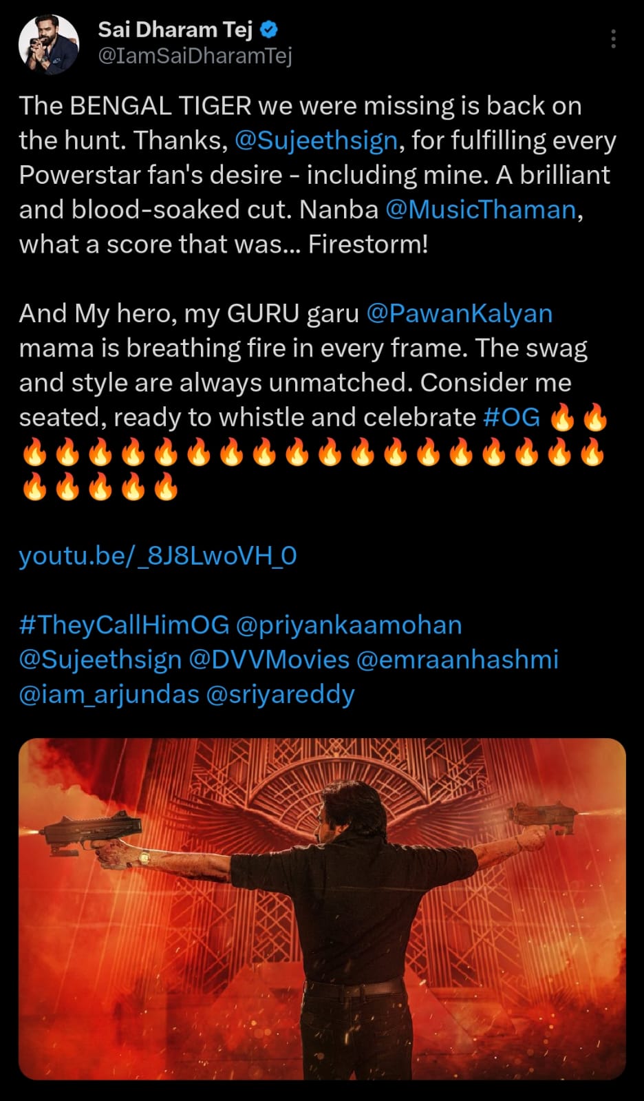 ‘మేం ఇన్నాళ్లుగా మిస్ అవుతున్న బెంగాల్ టైగర్ ఇప్పుడు వేటకు బయల్దేరింది..నాతో సహా ప్రతీ అభిమాని కోరిక తీర్చిన, అందరినీ సంతృప్తి పరిచిన సుజీత్ గారికి థాంక్స్.. ట్రైలర్ను అద్భుతంగా కట్ చేశారు.. నా ప్రియ మిత్రుడు తమన్ ఇచ్చిన బీజీఎం అయితే నిజంగానే ఫైర్ స్ట్రామ్..