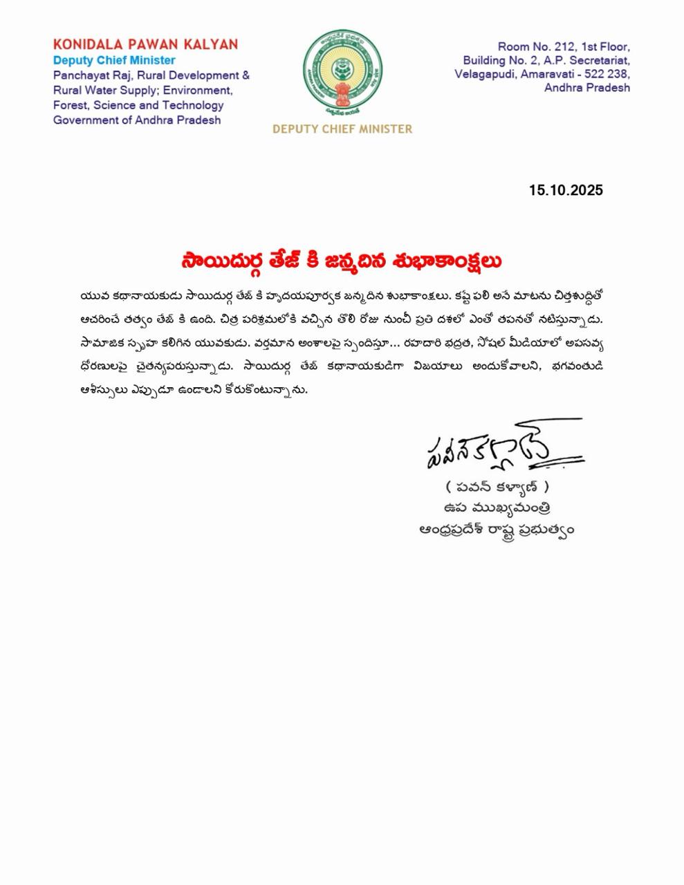 యువ కథానాయకుడు సాయిదుర్గ తేజ్ కి హృదయపూర్వక జన్మదిన శుభాకాంక్షలు. కష్టే ఫలి అనే మాటను చిత్తశుద్ధితో ఆచరించే తత్వం తేజ్ కి ఉంది. చిత్ర పరిశ్రమలోకి వచ్చిన తొలి రోజు నుంచీ ప్రతి దశలో ఎంతో తపనతో నటిస్తున్నాడు. సామాజిక స్పృహ కలిగిన యువకుడు. వర్తమాన అంశాలపై స్పందిస్తూ… రహదారి భద్రత, సోషల్ మీడియాలో అపసవ్య ధోరణులపై చైతన్యపరుస్తున్నాడు. సాయిదుర్గ తేజ్ కథానాయకుడిగా విజయాలు అందుకోవాలని, భగవంతుడి ఆశీస్సులు ఎప్పుడూ ఉండాలని కోరుకొంటున్నాను.