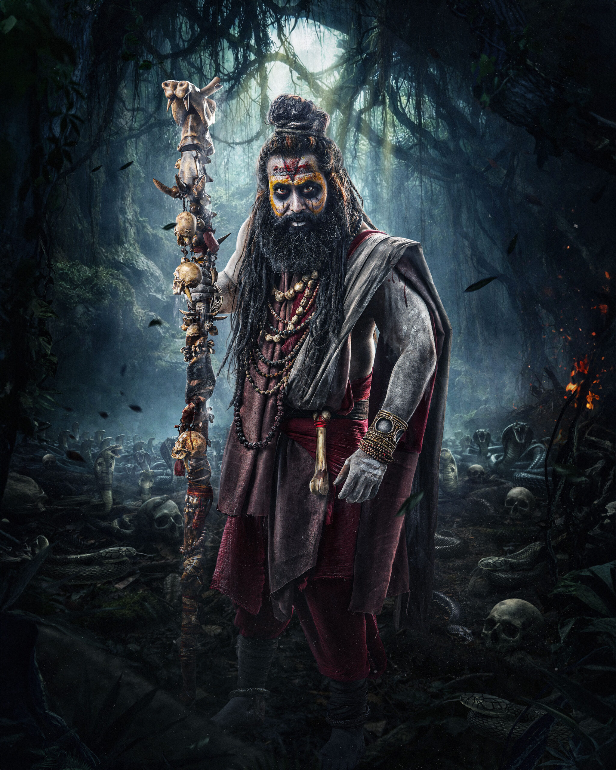 గరుడ రామ్ చేతిలో కపాలాలు, ఎముకలు, పాములతో అలంకరించిన భారీ దండ కనిపిస్తూ, చీకటి, నిషిద్ధ శక్తులను సూచిస్తోంది. అడవి, పాములు, చెల్లాచెదురుగా ఉన్న కపాలాలు మరింత క్యురియాసిటీ పెంచుతున్నాయి.
